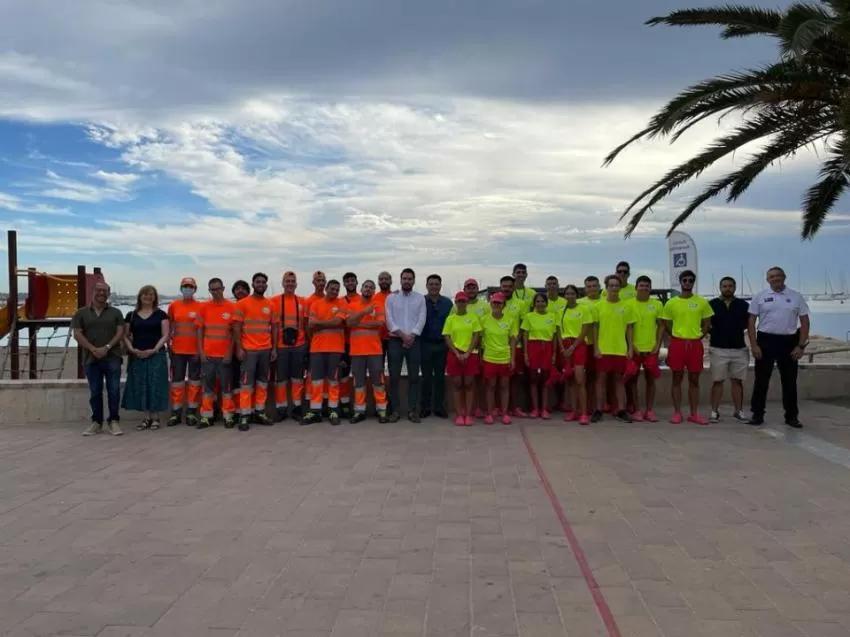 El alcalde José Miguel Luengo y el concejal de Hacienda y Desarrollo Local, Héctor Verdú visitaron hoy, en la explanada Barnuevo, de Santiago de la Ribera, a los 27 alumnos de los dos programas mixtos de formación y empleo que con la denominación “San Javier Limpieza” y “San Javier Socorrismo”, se celebran actualmente en San Javier, subvencionados por el Servicio de Empleo y Formación, SEF.