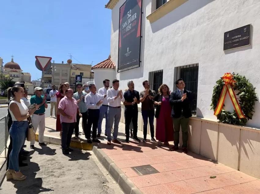 El alcalde de San Javier, José Miguel Luengo y la teniente de alcalde , María Dolores Ruiz han depositado este miércoles una corona de laurel junto a placa que da nombre a la avenida Miguel Ángel Blanco, de San Javier, en homenaje al joven concejal de Ermua, cuando se cumple 25 años de su asesinato a manos de ETA.