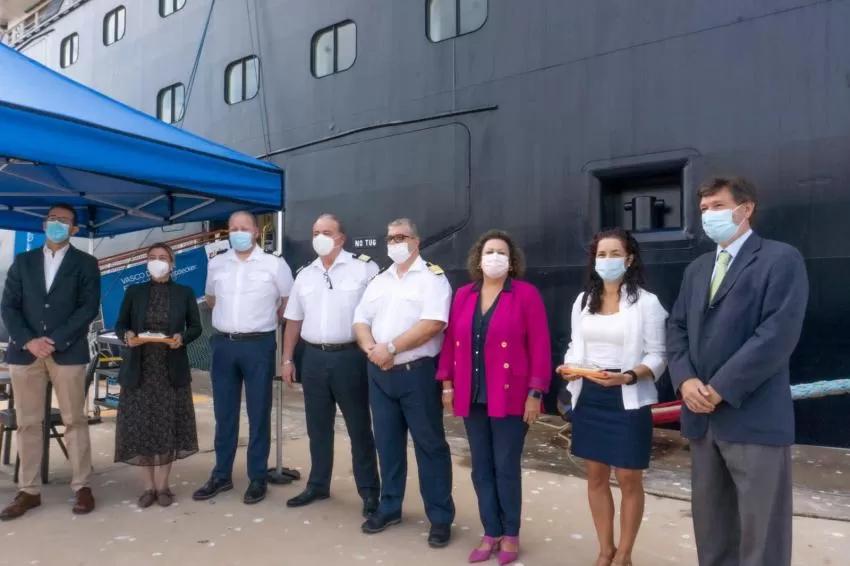 Muñoz, acompañada de la concejala de Turismo de Cartagena, Cristina Pérez, del responsable de la consignataria Erhardt Mediterráneo, Sergio Conesa, y de personal responsable de cruceros de la APC, han dado la bienvenida al capitán del buque Vasco de Gama, en su primer atraque en el puerto de Cartagena con el tradicional intercambio de metopas.