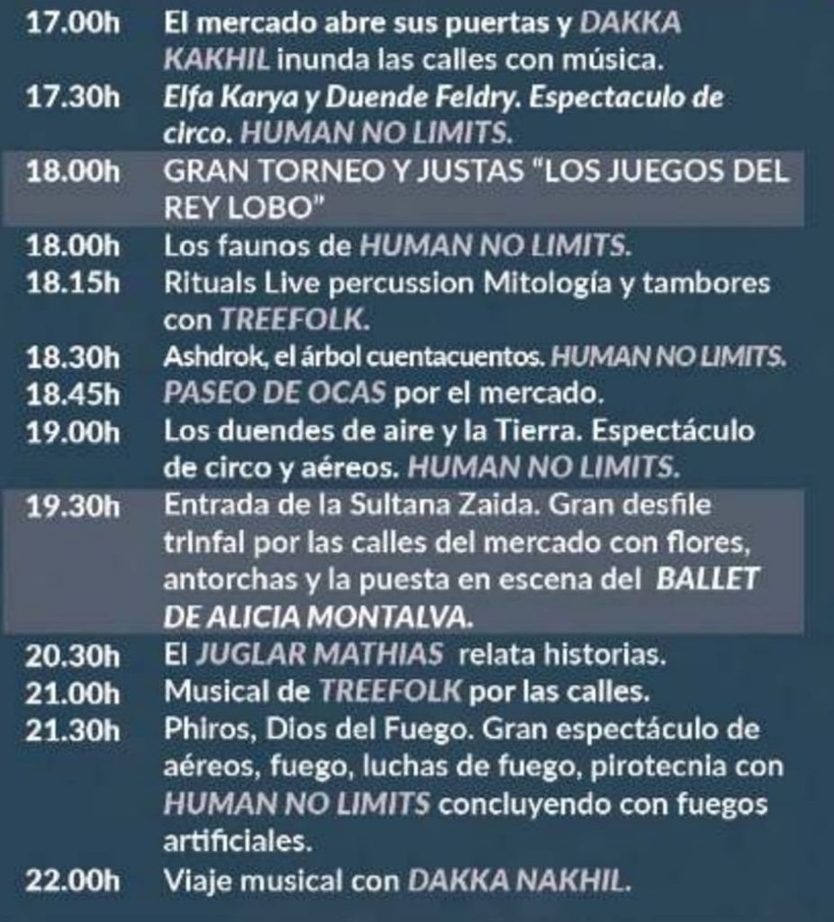Hoy sábado podemos disfrutar entre otras muchas actividades del gran torneo y justas “Los juegos del rey Lobo” que dará comienzo a las 18.00h y que también se podrá ver el domingo a la misma hora. Un poco más tarde, a las 19.30h tendremos una cita con el Ballet de Alicia Montalva en el gran desfile triunfal que tendrá lugar por las calles del mercado.