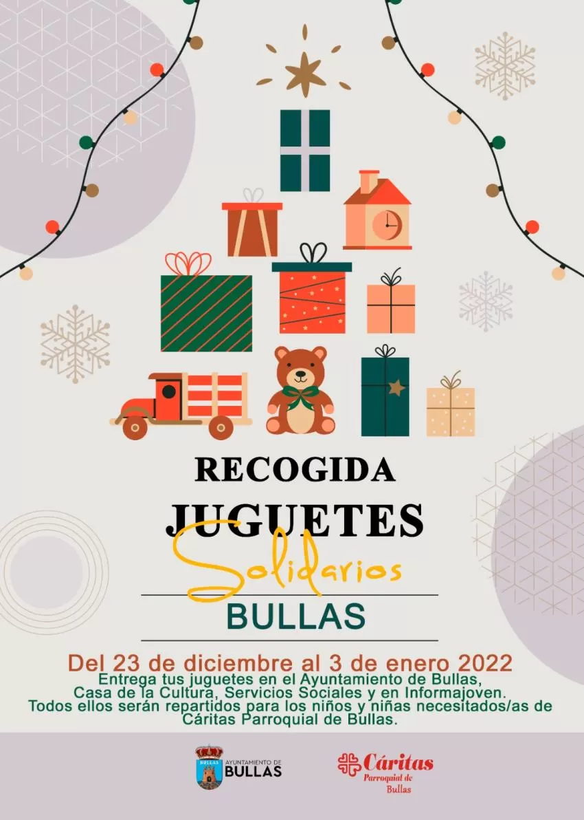 Así, del 23 de diciembre al 3 de enero se podrán entregar juguetes en los Servicios Sociales, en el Ayuntamiento de Bullas y en el Informajoven en la Casa de Cultura. Todos se repartirán entre los niños y niñas necesitados/as de Cáritas Parroquial de Bullas.