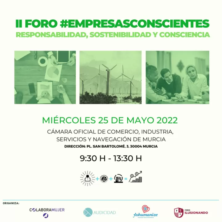 Mañana vuelve la II edición del Foro de Empresas Conscientes que se celebra en la Cámara de Comercio de Murcia, promovido y organizado por la asociación Colabora Mujer, Audicidad, Yohumanize y Foro Ilusionando.