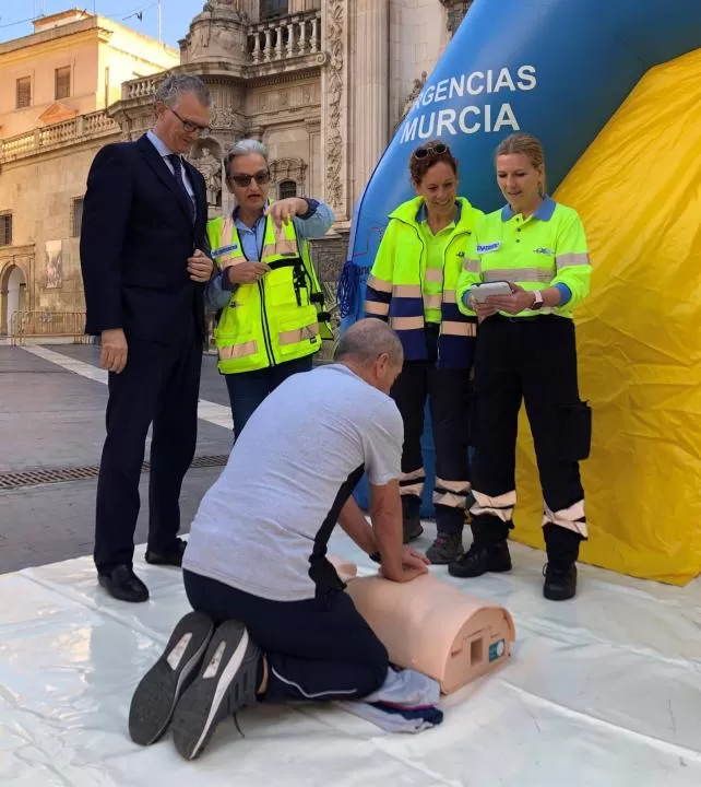 El 16 de octubre se celebra el Día Europeo de Concienciación del Paro Cardiaco, bajo el lema 'Todos los ciudadanos del mundo pueden salvar una vida'. Con este motivo, el 061 ha instalado hoy en la Plaza de Belluga de Murcia una carpa para enseñar a realizar la reanimación cardiopulmonar básica (RCP) a todas las personas interesadas.