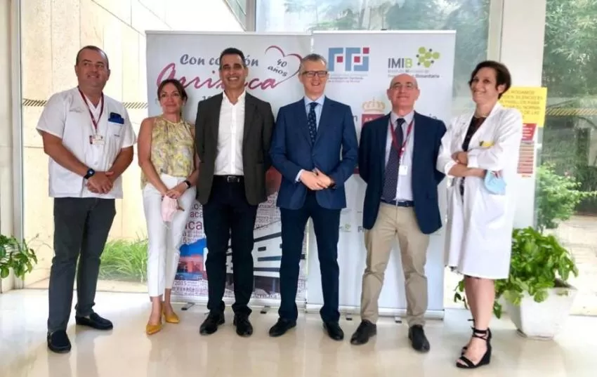 En la imagen, de izquierda a derecha, el director de Enfermería del área I, Javier Iniesta; la directora de la FFIS, Fuensanta Martínez; el jefe de Oncología de la Arrixaca, José Luis Alonso; el consejero de Salud, Juan José Pedreño; el gerente del área I, Francisco Soriano; y la directora médico del área I, Juana Fernández.