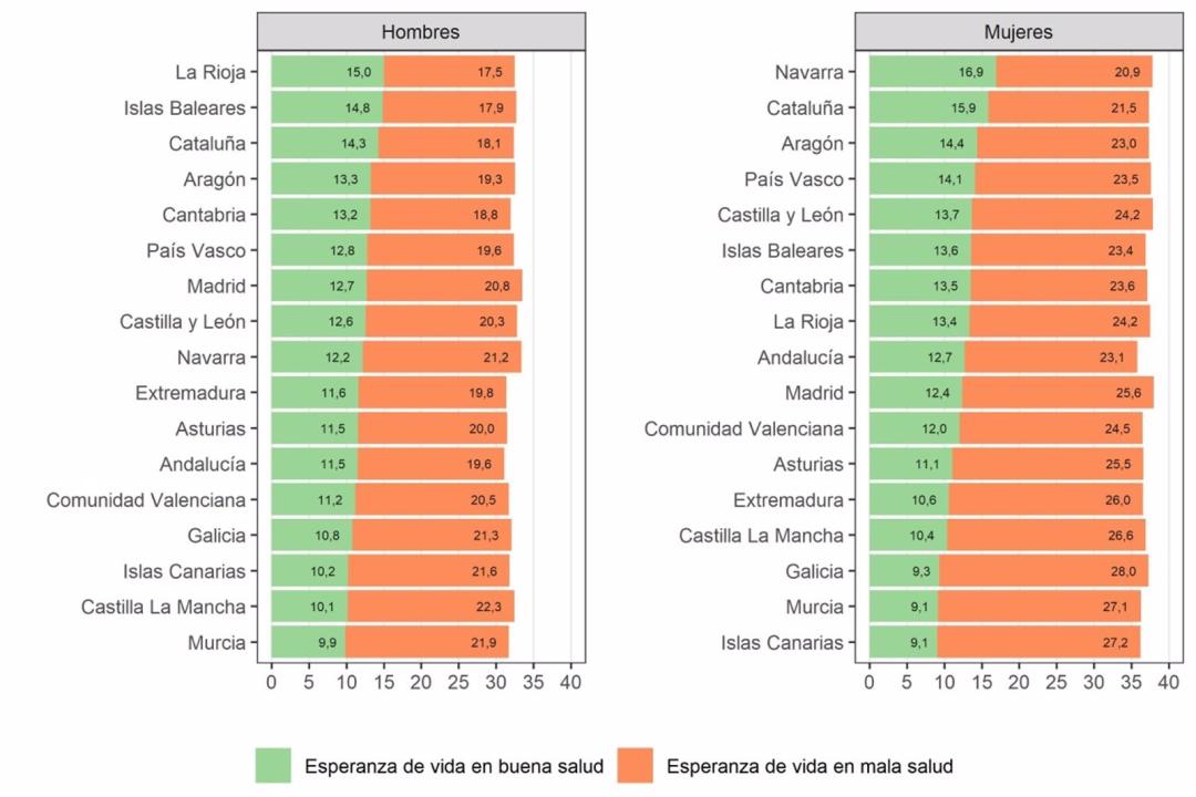 Las comunidades autónomas que tienen una esperanza de vida en buena salud más alta son la Rioja, Islas Baleares y Catalunya en hombres y Navarra, Catalunya y Aragón en mujeres, mientras que por la cola se encuentran Murcia, Castilla la Mancha e Islas Canarias en hombres e Islas Canarias, Murcia y Galicia en mujeres.
