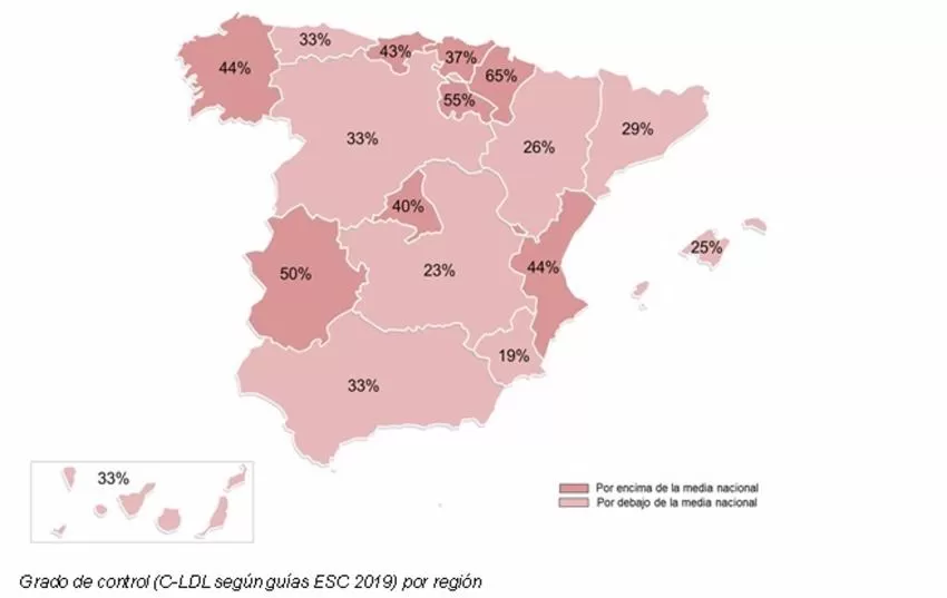 Este es el orden de mejor control de pacientes con colesterol por comunidades: Navarra 65 por ciento; La Rioja 55 por ciento; Extremadura 50 por ciento; Comunidad Valenciana 44 por ciento; Galicia 44 por ciento; Cantabria 43 por ciento; Comunidad de Madrid 40 por ciento; País Vasco 37 por ciento; Andalucía, Asturias, Castilla y León y Canarias 33 por ciento; Cataluña 29 por ciento; Aragón 26 por ciento; Baleares 25 por ciento; Castilla-La Mancha 23 por ciento; y Región de Murcia 19 por ciento.
