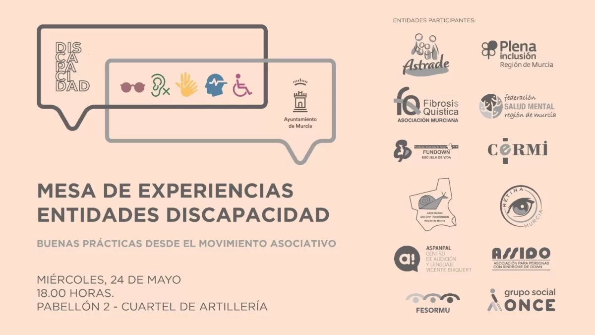 Las entidades que expondrán sus experiencias son Astrade, Plena Inclusión, On-Off Parkinson, Retina Murcia, Asociación Murciana de Fibrosis Quística, Federación Murciana de Salud Mental, Aspanpal, Assido, ONCE y Fundown.