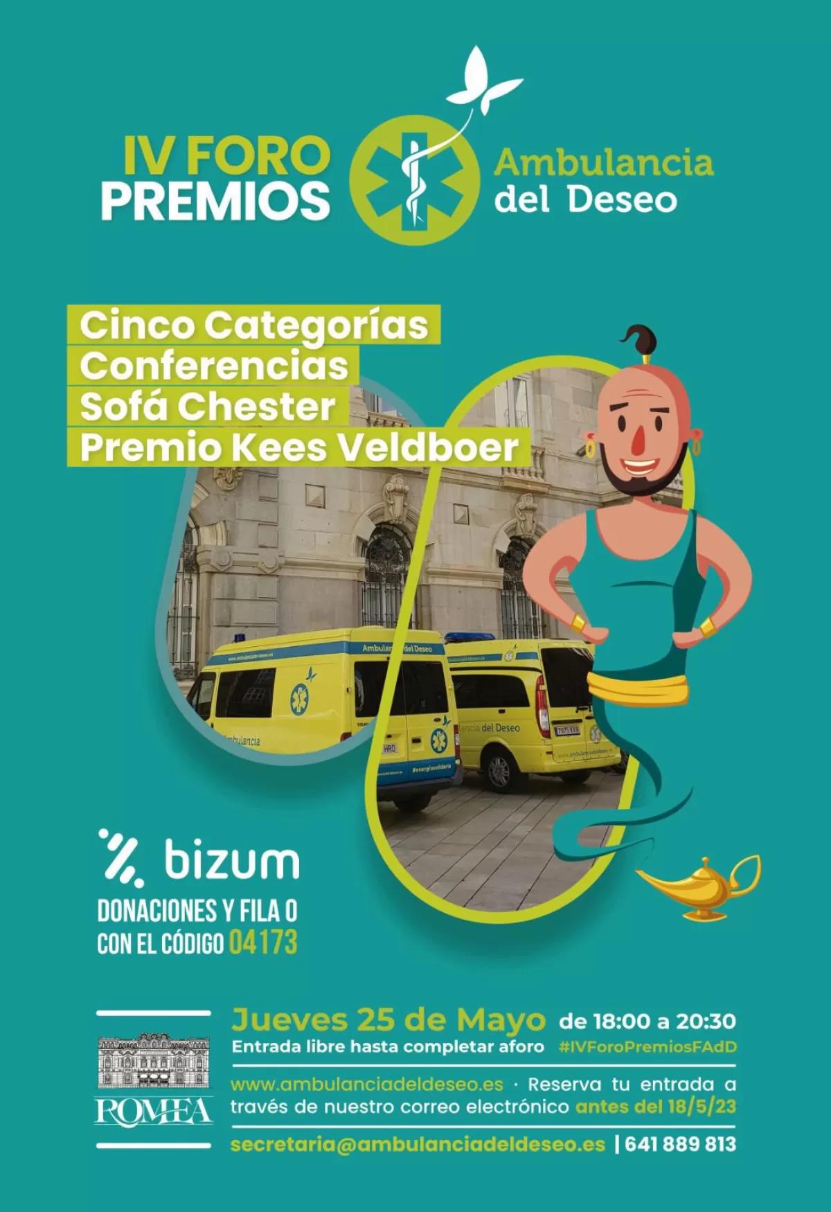 El Foro 'Premios Ambulancia del Deseo', un evento que se celebra de manera anual en la ciudad de Murcia, se celebrará el próximo jueves, a partir de las 18.00 horas en el Teatro Romea de Murcia. Durante la gala la fundación entrega cinco premios en diferentes categorías, se comparten conferencias, entrevistas y un sofá 'chester' cargado de emociones.