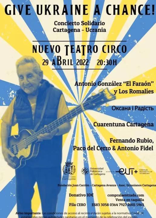 Cartagena acogerá el concierto benéfico Give Ukraine a chance!, que se celebra este viernes y ha organizado la Fundación Juan Carrión con la colaboración del Ayuntamiento de Cartagena, la UPCT, Cartagena Avanza y la Comunidad de Ucranianos en Cartagena, según han informado fuentes municipales en un comunicado.
