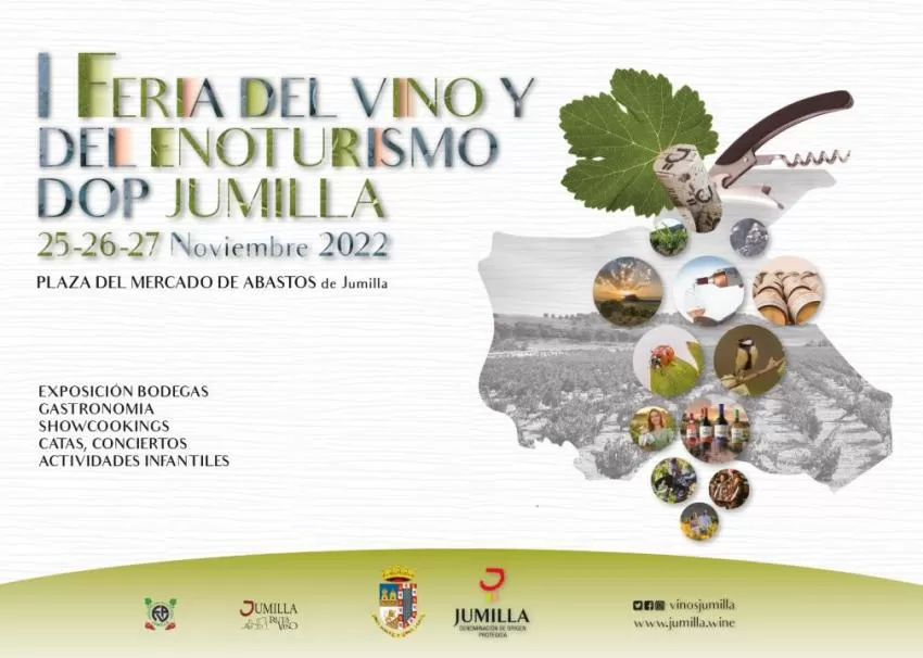 El fin de semana del 25 al 27 de noviembre arranca la I Feria del vino y del enoturismo en la plaza del Mercado de Abastos de Jumilla. Este evento pretende dar visibilidad a la promoción y difusión de los vinos con esta Denominación de Origen del territorio como patrimonio cultural.