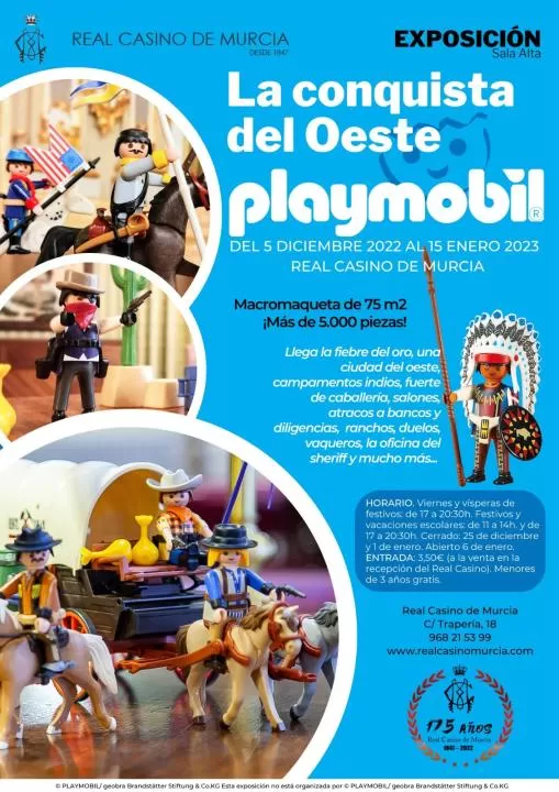 Indios, cowboys, tabernas, atracos, duelos al caer el sol y un sinfín de colonos enfrentándose a lo desconocido. Los clicks de Playmobil han sucumbido a la fiebre del oro y próximamente llegarán al Real Casino de Murcia con una impresionante exposición de temática western. Será a partir del próximo 5 de diciembre de 2022 y podrá verse hasta el 15 de enero de 2023 en la Sala Alta de la entidad.