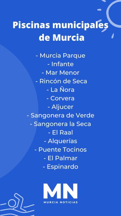 Las diferentes pedanías de Murcia también cuentan con piscinas en las que sobrellevar el calor. Hasta el 4 de septiembre estarán abiertas las de Rincón de Seca, La Ñora, Corvera, Aljucer, Sangonera La Verde, Sangonera La Seca, El Raal y Alquerías.