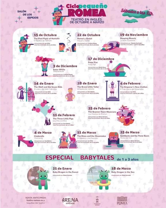 Una vez más, y desde el año 2013, se vuelve a poner en marcha el programa de cuentos dramatizados en inglés que cada sábado llena el Salón de los Espejos del Teatro Romea de Murcia. Se trata del Ciclo Pequeño Romea, un espacio en el que disfrutar la magia del Teatro, el encanto de los cuentos clásicos y la sorpresa de unas versiones muy especiales de la mano de los actores–profesores de ARENAaprende: Jon Mitó, Natalia Martínez, Eva Mataix, Cristina Roma, David Moya y Elena Serrano.