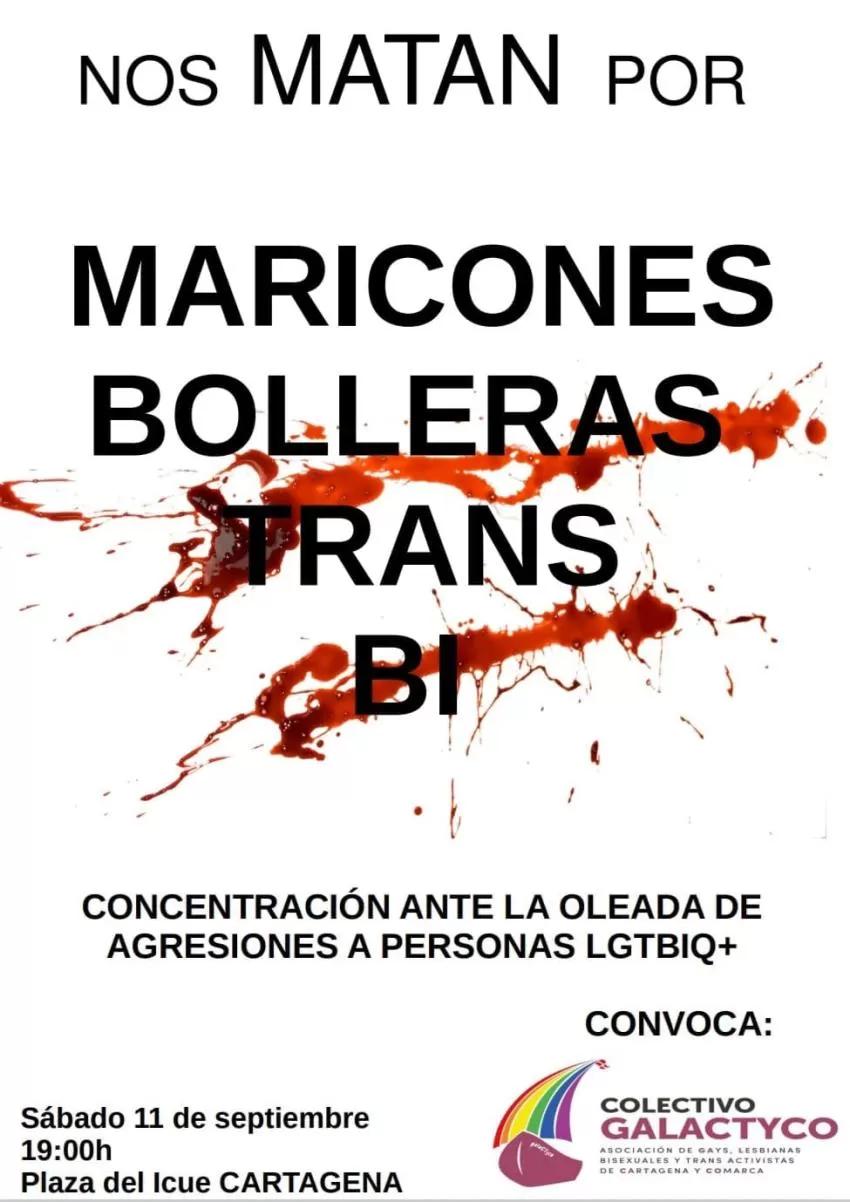 El Colectivo GALACTYCO de Cartagena y Comarca mantiene la concentración ciudadana convocada para este sábado, a las 19.00 horas, en la Plaza del Icue de la ciudad portuaria, en repulsa por el "alarmante" incremento de agresiones a personas del colectivo LGTBI+ en los últimos meses.