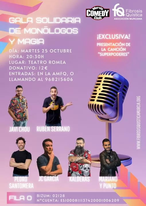 La Asociación Murciana de Fibrosis Quística ha organizado la IV Gala Solidaria de Monólogos y Magia a favor de la fibrosis quística, que se celebra el próximo martes 25 de octubre a las 20.30h en el Teatro Romea.