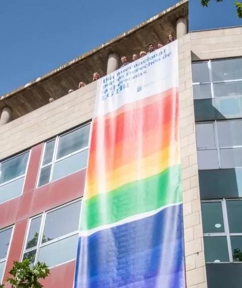 El balcón de la Consejería de Mujer, Igualdad, LGTBI, Familias, Política Social y Transparencia luce desde este viernes una bandera arcoíris de 12 metros con motivo de la celebración, el próximo martes 28, el Día del Orgullo LGTBI.