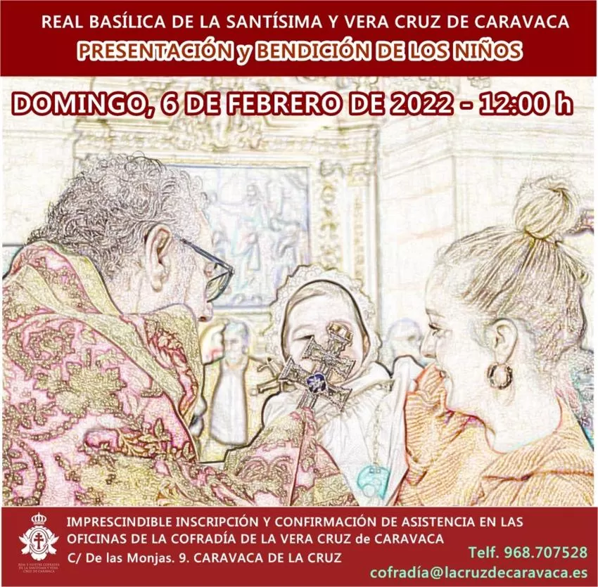 La Basílica de la Santísima y Vera Cruz de Caravaca de la Cruz acogerá el próximo domingo, 6 de febrero, a las 12.00 horas, la bendición y presentación a la patrona de los niños nacidos durante los años 2020 y 2021, informaron fuentes de la Cofradía en un comunicado.