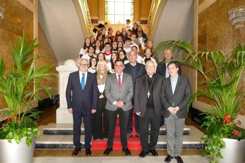 El alcalde José Antonio Serrano, acompañado por el presidente de la Fundación Jesús Abandonado, José Manuel Martínez; el responsable de Magic Line, Álvaro Castillejo, y el obispo de la Diócesis de Cartagena, José Manuel Lorca y los concejales Pedro García Rex y Ainhoa Sánchez, han presentado este lunes la 'Magic Line', una caminata solidaria que llegará en su primera edición en Murcia a través de la Fundación Jesús Abandonado.