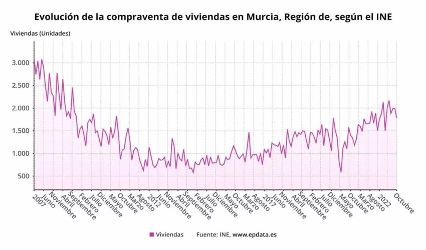 La compraventa de viviendas en la Región de Murcia en el mes de octubre ha crecido un 6,8% respecto al mismo mes del año anterior, hasta las 1.784 operaciones, inferior a la media del conjunto del país, que aumentó un 11,4%.