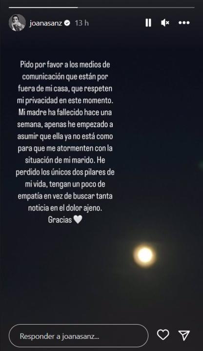 Joana Sanz, mujer de Dani, ha aprovechado sus redes sociales y ha pedido a los medios de comunicación "que respeten mi privacidad" en estos momentos en los que su pareja se encuentra en prisión provisional sin fianza. Rota de dolor, ha confesado que su madre "ha fallecido hace una semana" y apenas "he empezado a asumir que ella ya no está" como para que "me atormenten" con la situación del futbolista.