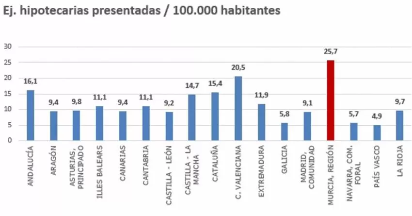 Los juzgados de Instancia de la Región registraron durante el segundo trimestre de 2022 un total de 393 ejecuciones hipotecarias, un 21,4% menos que en el mismo periodo del ejercicio anterior. A pesar del descenso registrado, la estadística sitúa a la Región de Murcia como la comunidad con más ejecuciones hipotecarias por cada 100.000 habitantes, con 25,7; seguida por la Comunidad Valenciana, con 20,5, y por Andalucía, con 16,1.