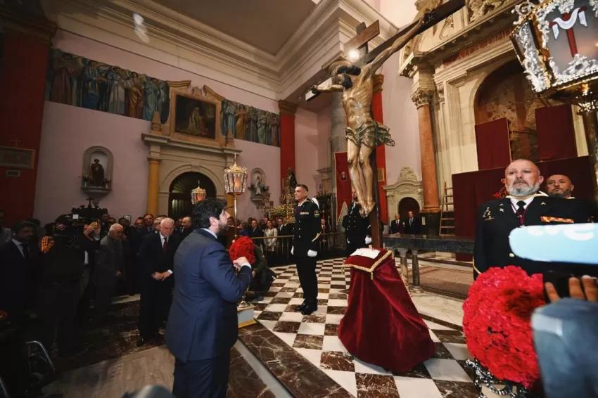 López Miras mostró su reverencia ante el crucificado, atribuido a Francisco Salzillo, horas antes de la popular procesión de la Cofradía del Santísimo Cristo del Perdón, que recorre cada año el centro de Murcia durante la tarde y noche del Lunes Santo.
