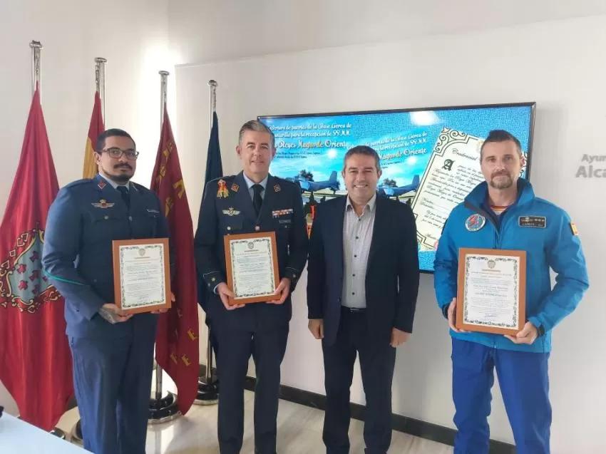 Hoy el alcalde de Alcantarilla, Joaquín Buendía, ha recibido al coronel de la Base Aérea, Alberto Lens, el capitán de la Patrulla Acrobática Paracaidista del Ejército del Aire (PAPEA), José Luis Lomas, y al soldado de la Escuela Militar de Paracaidismo Méndez Parada, Carlos Aguilar, que alojarán en sus hogares al Rey Melchor, Gaspar y Baltasar, respectivamente.