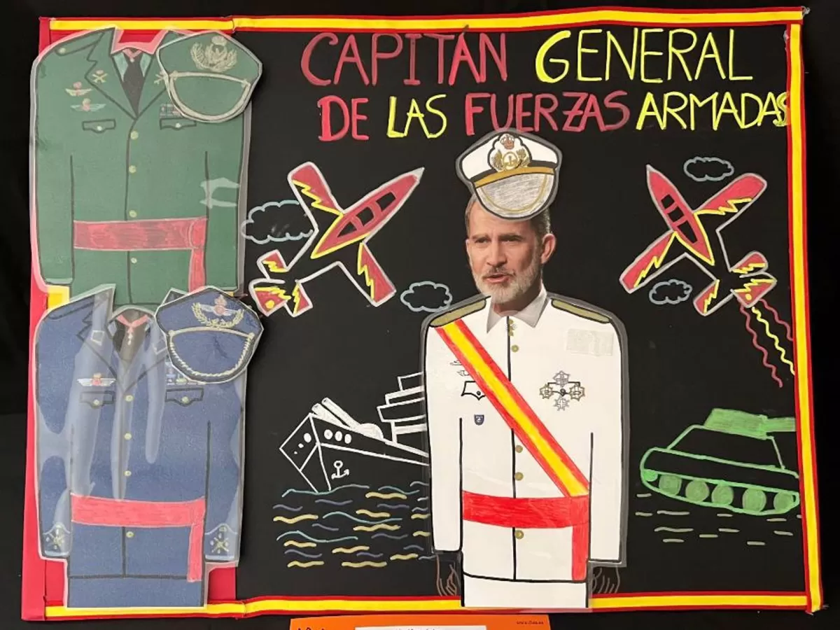 Para ello, el escolar murciano utiliza un juego de figura recortable del monarca, al que se puede "vestir" con los uniformes máximo representante de la rama terrestre de las Fuerzas Armadas, del Ejército del Aire y de la Armada.