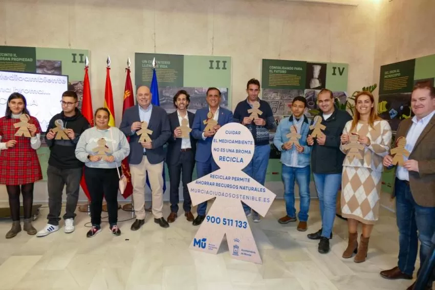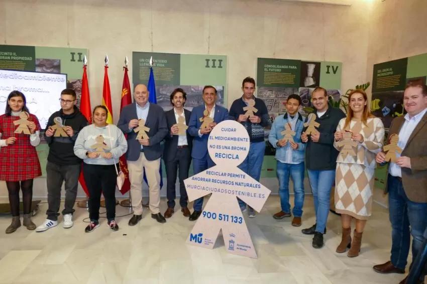 El alcalde, José Antonio Serrano, acompañado por la concejala de Movilidad Sostenible y Limpieza Viaria, Carmen Fructuoso, el delegado de PreZero en Murcia, Eduardo Azcona, el gerente de Fundown, Pedro Martínez y la coordinadora de Formación Profesional de Fundown, Inés Marques, ha presentado este miércoles la campaña 'El medio ambiente no es broma'.