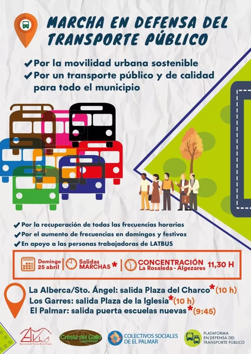 La movilización vecinal ha sido convocada por la PLATAFORMA EN DEFENSA DEL TRANSPORTE PÚBLICO, integrada por colectivos sociales del municipio y del área metropolitana entre los que hay sindicatos de trabajadores y trabajadoras de la concesionaria LAT.