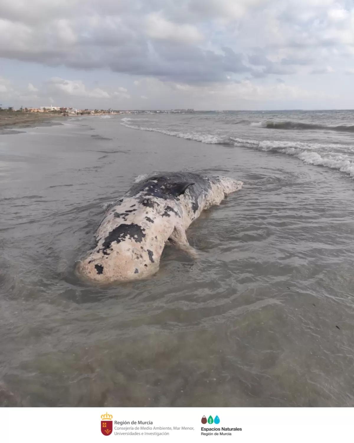 El cadáver de un cachalote de unos cinco metros apareció la semana pasada varado en la playa Torre Derribada del municipio de San Pedro del Pinatar, según ha informado el Parque Regional Salinas San Pedro del Pinatar a través de su perfil de Twitter, una cuenta oficial de la Consejería de Medio Ambiente, Mar Menor, Universidades e Investigación.