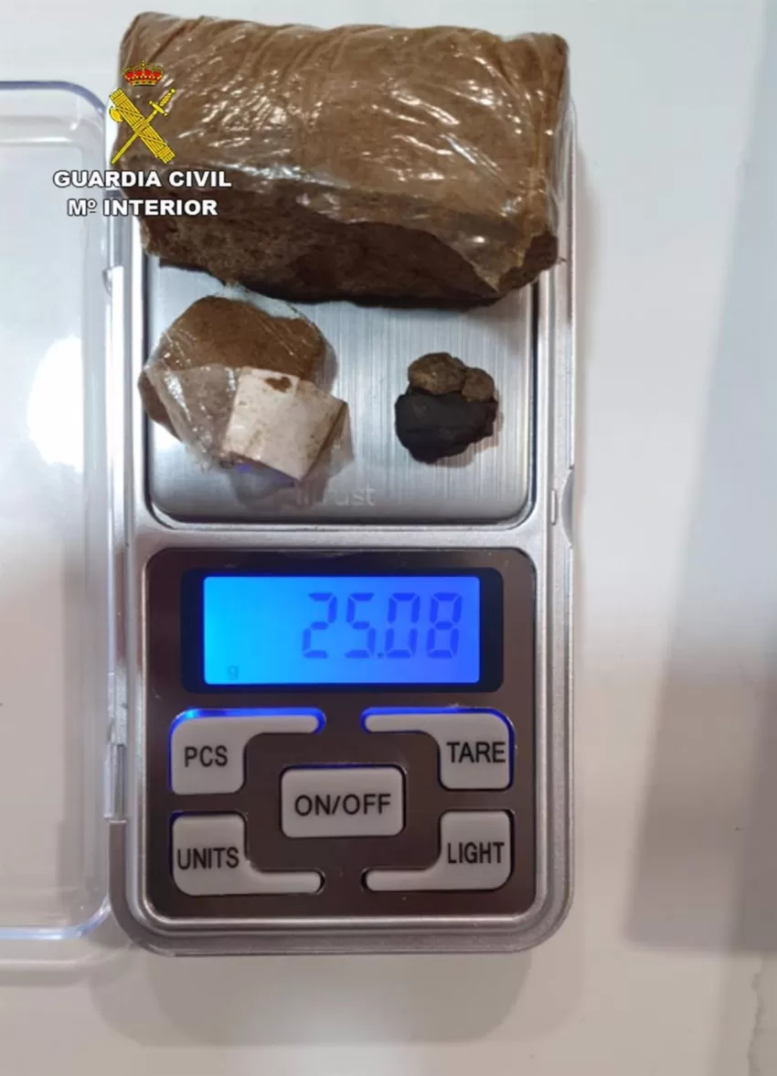 La inspección del local se ha saldado con la incautación de 25 gramos de hachís, cerca de 500 euros y diversos envoltorios supuestamente utilizados para dosificar el hachís, según informaron fuentes de la Benemérita en un comunicado.