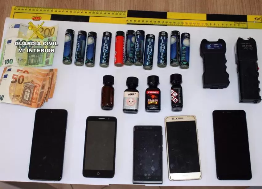 Una vez obtenidos todos los indicios necesarios, previa autorización judicial, la Guardia Civil ha efectuado la entrada y el registro del domicilio del sospechoso, donde se ha aprehendido una quincena de recipientes de poppers, dos pistolas eléctricas tipo Táser -armas prohibidas-, efectivo, un ordenador portátil y varios terminales de telefonía móvil presuntamente usados para el contactar con clientes y colgar anuncios en páginas de adultos.