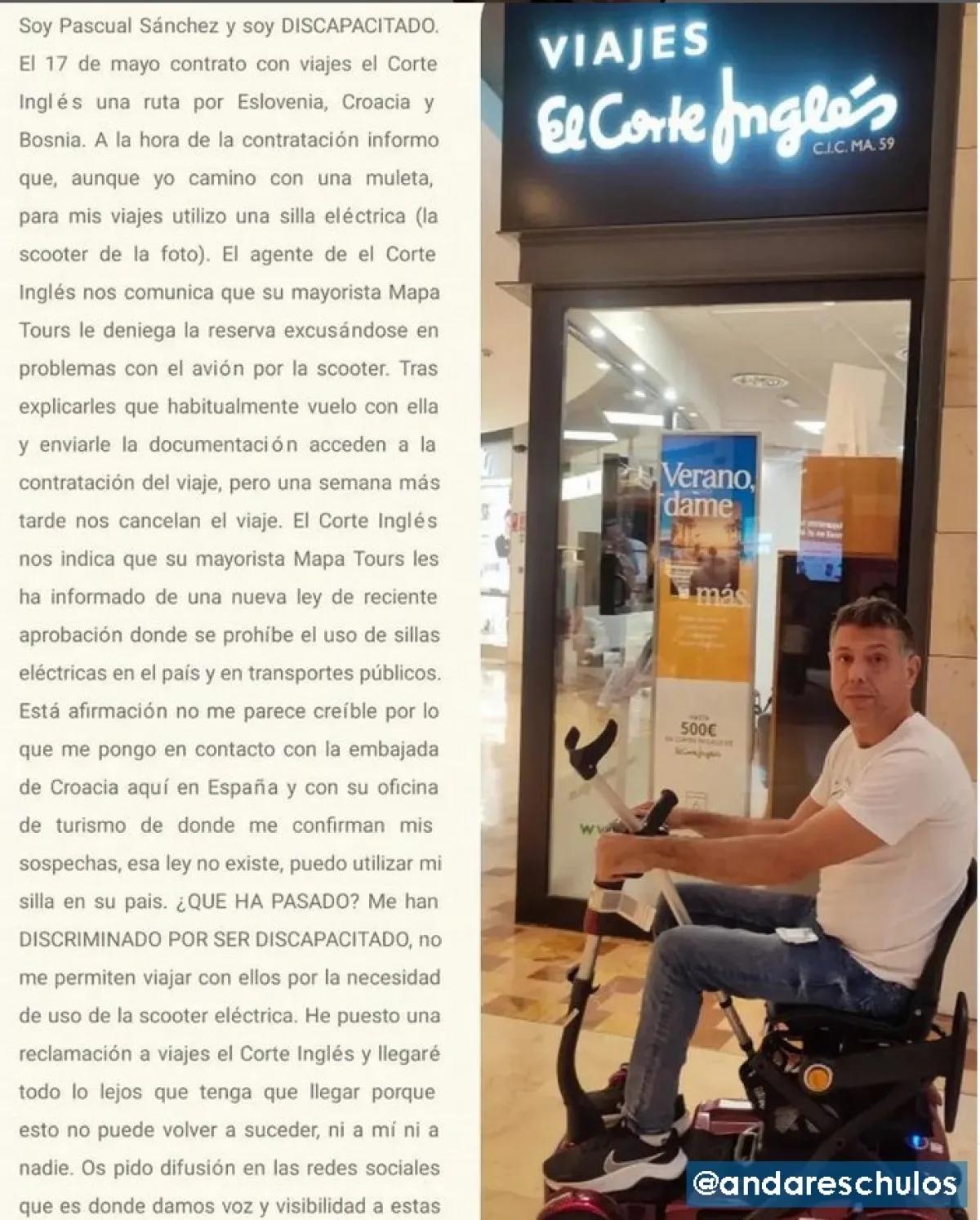Pascual Sánchez, un vecino de Cieza con discapacidad, ha denunciado a FAMDIF/COCEMFE-MURCIA y a través de sus redes sociales, el trato discriminatorio que recibió por parte de la agencia de viajes de El Corte Inglés.