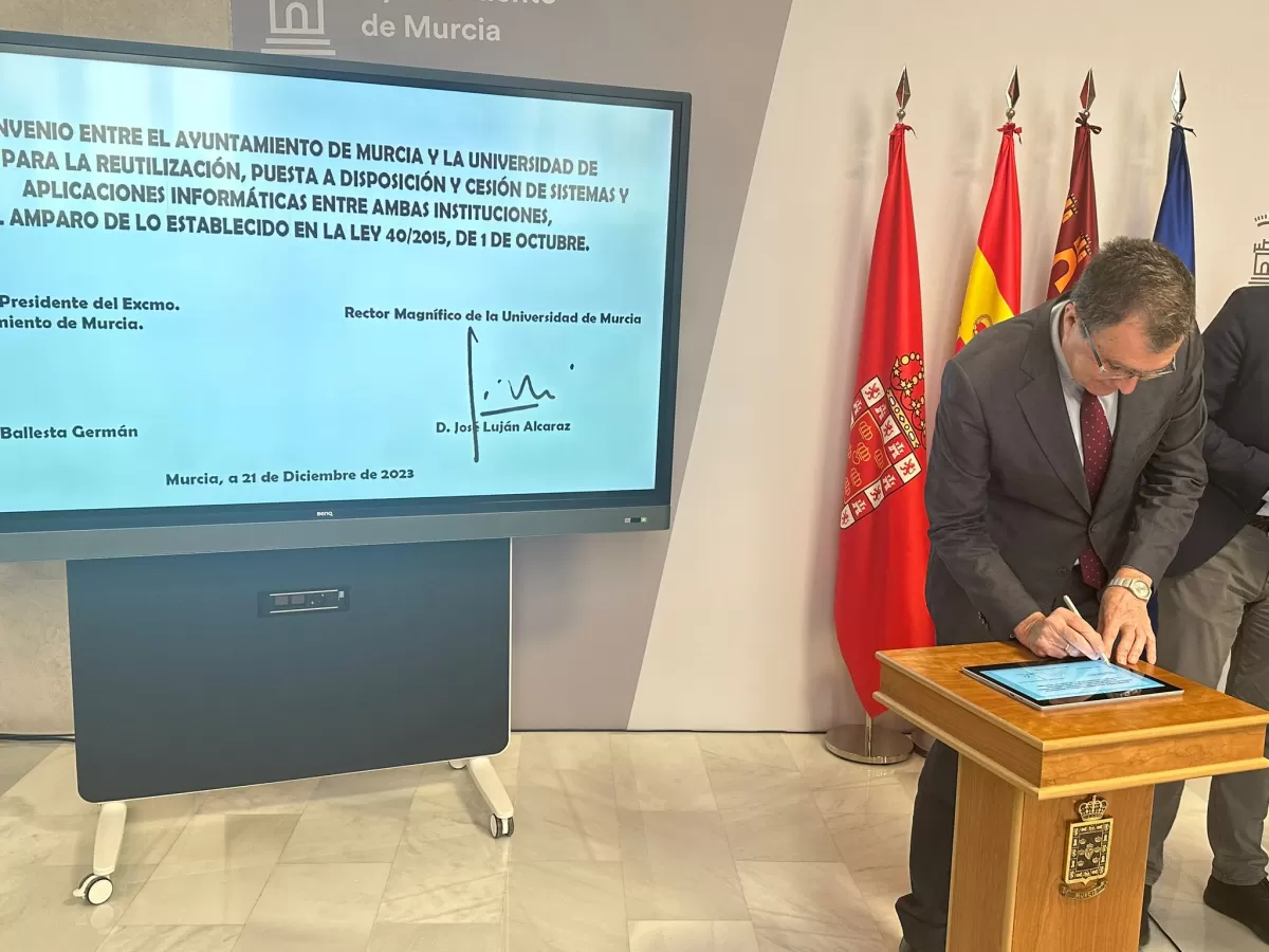 El acuerdo, que se ha suscrito para un periodo de cuatro años, establece la interacción recíproca para que el Ayuntamiento y la Universidad de Murcia aprovechen las plataformas, herramientas, aplicaciones, soluciones tecnológicas de administración electrónica y servicios telemáticos que hayan desarrollado o adquirido cada una de las entidades.