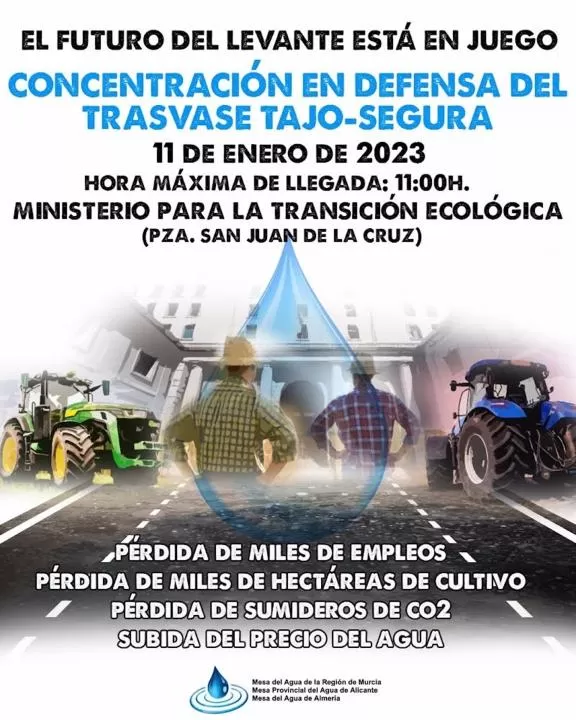 La protesta comenzará en la Plaza de San Juan de la Cruz en torno a las 10.30 horas bajo el lema "En el Levante, sin trasvase, desierto y paro" ante acuerdo para aumentar el caudal ecológico del río Tajo de aquí a 2027 que supondrá una disminución de las aportaciones del acueducto Tajo-Segura a los caudales de las provincias de Alicante, Murcia y Almería de unos 105 hectómetros cúbicos.