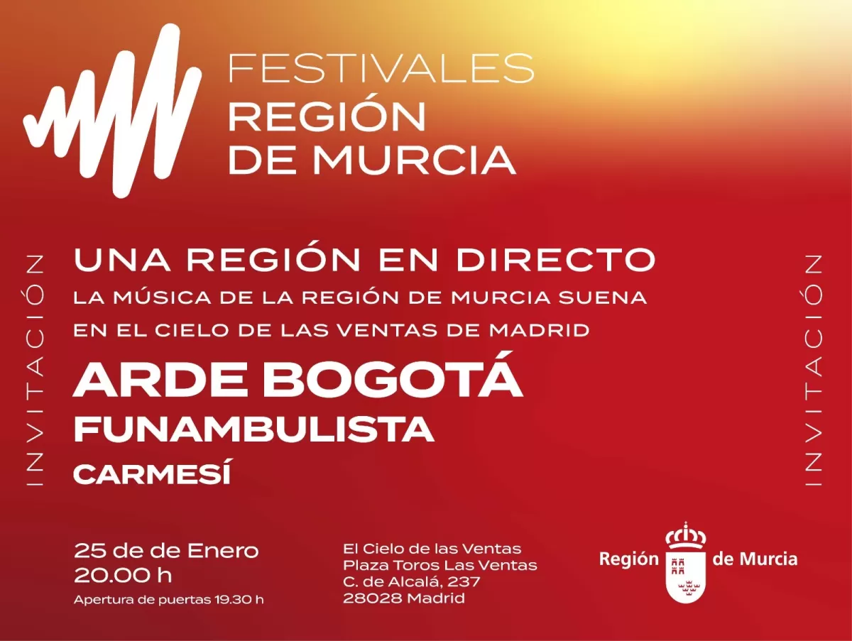 El Gobierno regional promocionará la marca ‘Festivales Región de Murcia, Más Música’ durante la Feria Internacional de Turismo (Fitur) 2024, con un concierto exclusivo de Arde Bogotá, Funambulista y Carmesí en el espacio ‘El Cielo de la Ventas’ el próximo día 25 de enero.