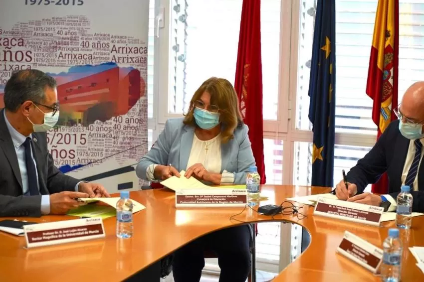 La firma del convenio ha tenido lugar en la Sala de Juntas del Hospital Virgen de la Arrixaca con la presencia de la consejera de Educación, María Isabel Campuzano, el rector de la Universidad de Murcia, José Luján, y el director gerente del Servicio Murciano de Salud (SMS), Francisco José Ponce Lorenzo.