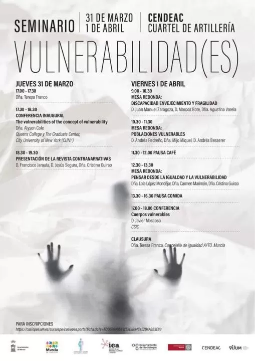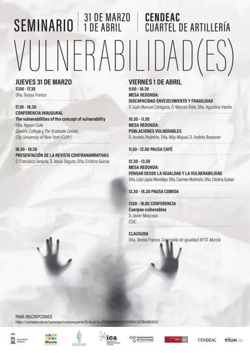 El Seminario Vulnerabilidad, organizado por el departamento de Sociología, el grupo de investigación Sociología del Bienestar y del Envejecimiento y la Unidad para la Igualdad entre Mujeres y Hombres de la Universidad de Murcia (UMU), tendrá un programa centrado en la vulnerabilidad como condición del sujeto contemporáneo y se enfocará desde diversas áreas y campos de la investigación social, la filosofía y la historia del arte.