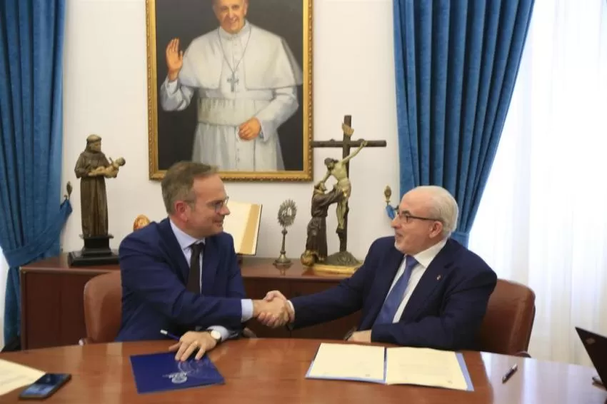 Los presidentes de la Universidad Católica de Murcia (UCAM) y de la Federación de Asociaciones de Familias Católicas de Europa (FAFCE), José Luis Mendoza y Vincenzo Brassi, respectivamente, han firmado un convenio por el que se crea la Cátedra Europea de Políticas Públicas, Tributos y Familia que tiene como objetivo poner en valor el papel esencial que desempeña la familia en la sociedad.