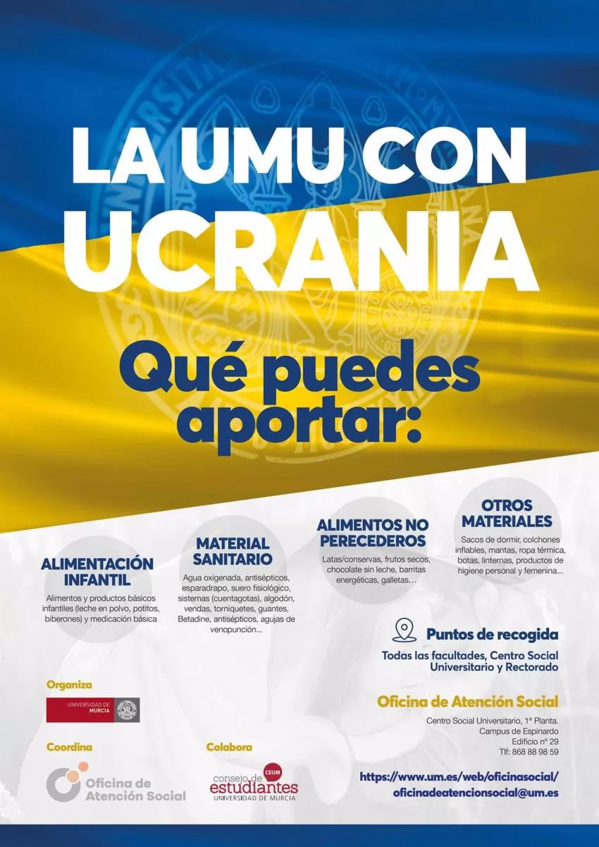La Universidad de Murcia (UMU) ha organizado junto a más de una decena de asociaciones de ucranianos en la Región de Murcia, una recogida de material sanitario, alimentos no perecederos, mantas y ropa de abrigo para ayudar con carácter urgente al pueblo ucraniano, según han informado fuentes de la institución docente en un comunicado.