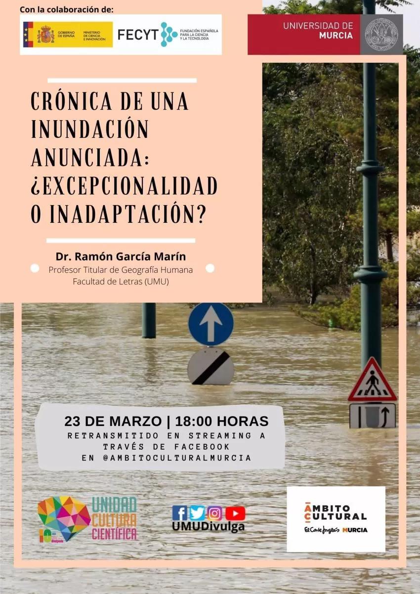 'Crónica de una inundación anunciada: ¿excepcionalidad o inadaptación?' es el título de la tercera charla del ciclo de conferencias organizadas por la Unidad de Cultura Científica e Innovación (UCC+i) de la Universidad de Murcia (UMU) en colaboración con la Sala de Ámbito Cultural de El Corte Inglés, informaron fuentes de la institución docente en un comunicado.