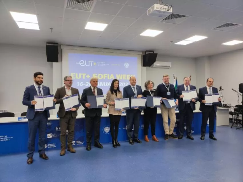La rectora de la UPCT y sus siete homólogos de las otras politécnicas que conforman la European University of Technology (EUt+) firmaron ayer este acuerdo en Sofía, Bulgaria. Al encuentro acudió la comisaria europea de Innovación e Investigación, Mariya Gabriel, quien con su visita remarca el apoyo de la Comisión Europea al consorcio.