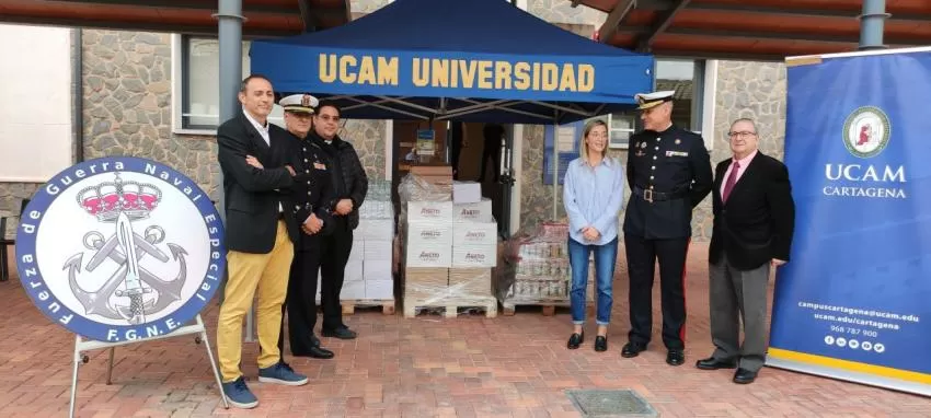 José Acuña, director de Relaciones Institucionales de UCAM Cartagena, ha entregado esta mañana a la Fuerza de Guerra Naval Especial la donación de 1,5 toneladas de alimentos para tal fin. La misma se ha realizado en el campus de la UCAM en Cartagena, ciudad desde la que partirán los militares con sede en la Algameca. Desde la Fuerza de Guerra Naval Especial han agradecido la colaboración de la Universidad Católica con el Ejército y quienes más lo necesitan.